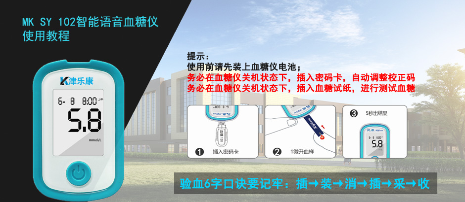 民康MK SY102智能語音血糖儀使用教程,提示: 使用前請先裝上血糖儀電池; 務(wù)必在血糖儀關(guān)機狀態(tài)下,插入密碼卡,自動調(diào)整校正碼 務(wù)必在血糖儀關(guān)機狀態(tài)下,插入血糖試紙,進(jìn)行測試血糖